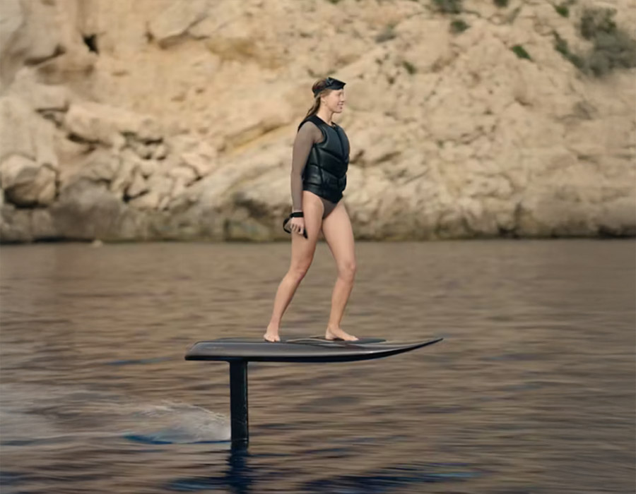Gesteuert wird der leise elektrische Antrieb über eine Handfernbedienung, sodass bereits bei ca. 17 km/h der Flügel das Board aus dem Wasser hebt. Das Board selbst wiegt 18 kg, ohne Akku.